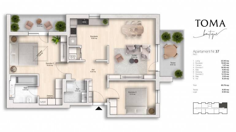Apartamentul cu nr. 37 are o terasa deschisa de 8,5 mp si un balcon tip logie de 6,5 mp.