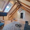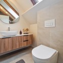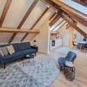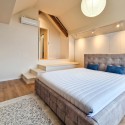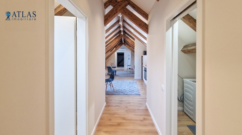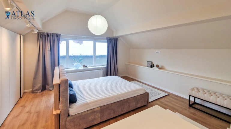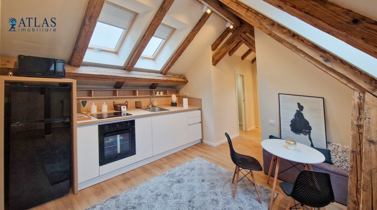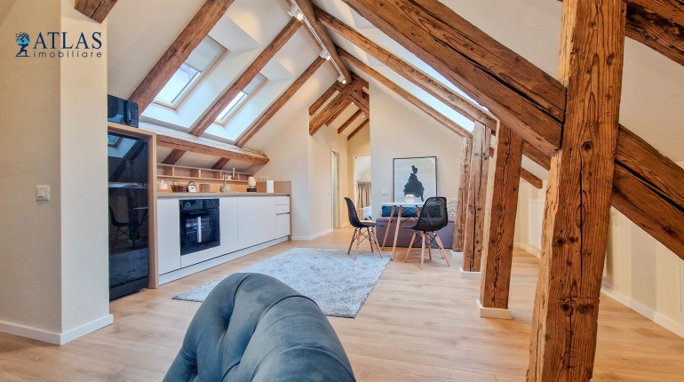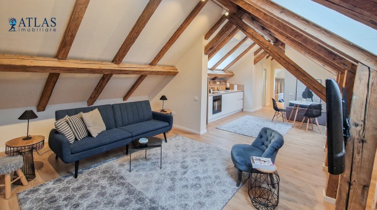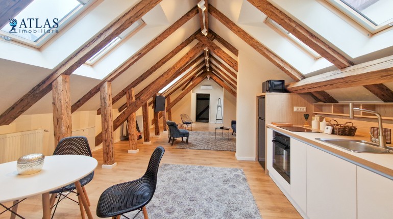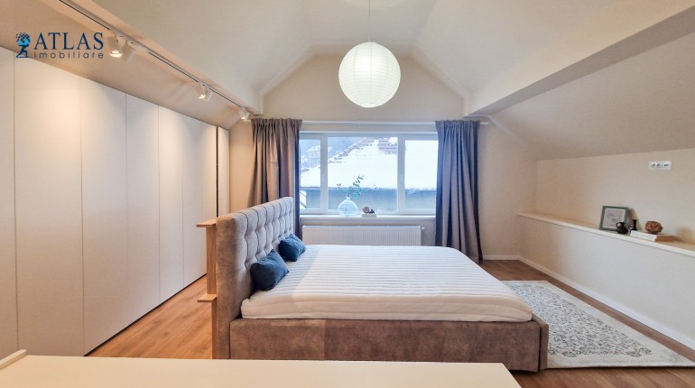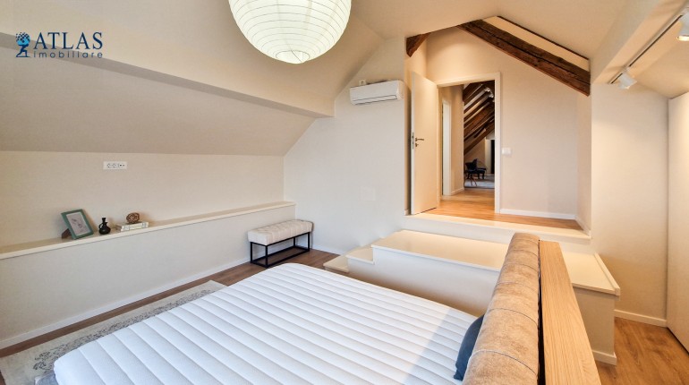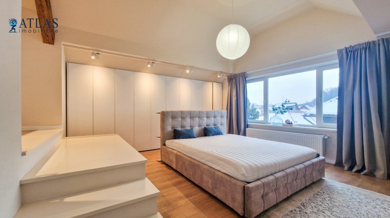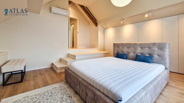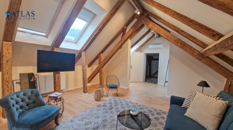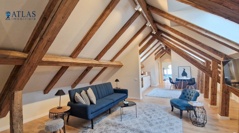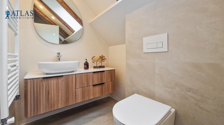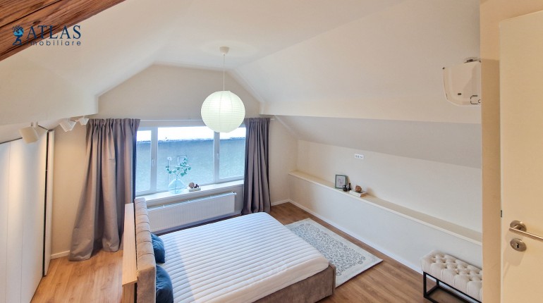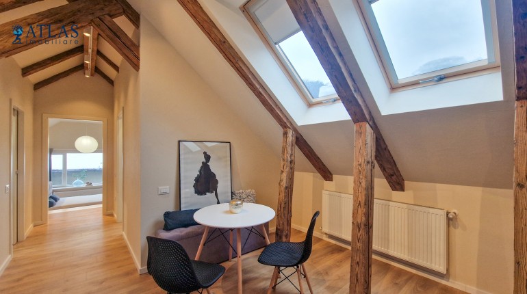 Design-ul orientat spre stilul unui chalet de lux, pastrarea unor elemente aparente ale structurii de lemn care imbina elemente rustice cu elemente minimalist contemporane, pozitia acestei proprietati, amenajarea ergonomica si spatiul foarte generos de peste 100 mp., fac din aceasta proprietate locuinta ideala pentru o persoana single sau pentru un cuplu.