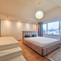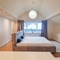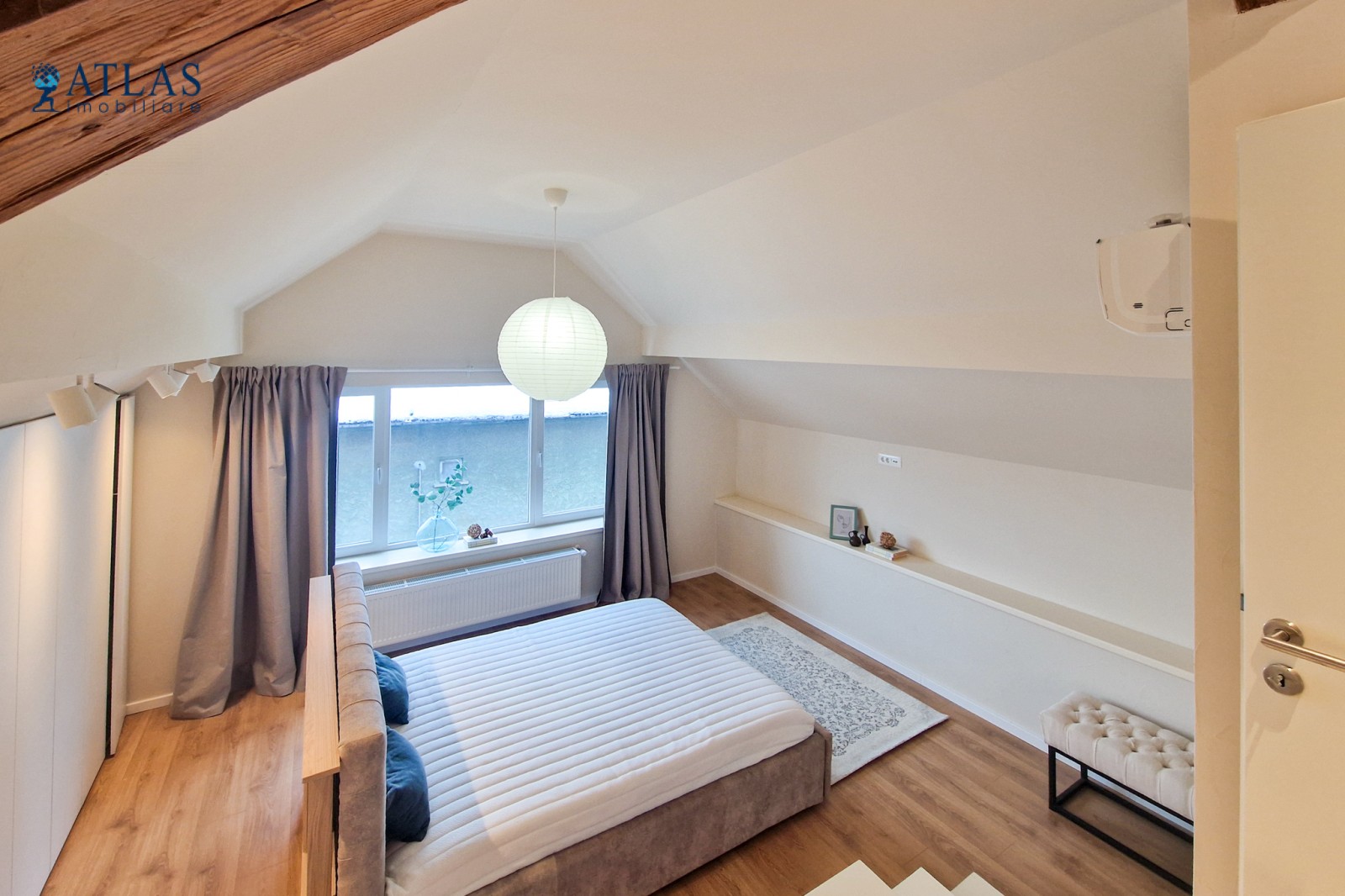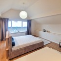 Dormitor cu geam mare, pat matrimonial, multe spatii de depozitare haine, inteligent disimulate si o priveliste superba catre padure;