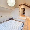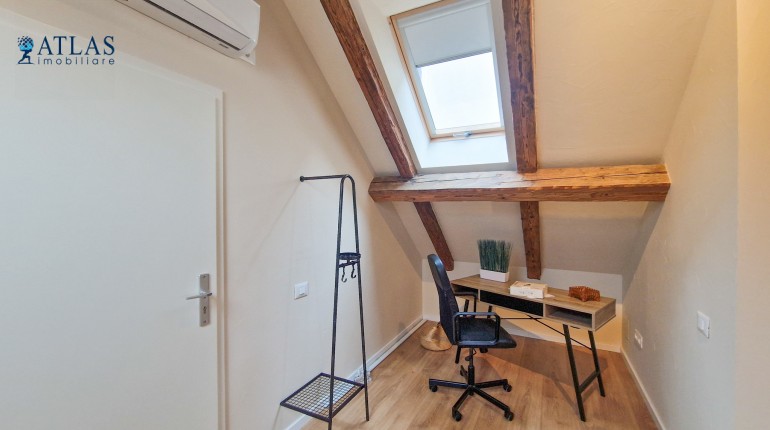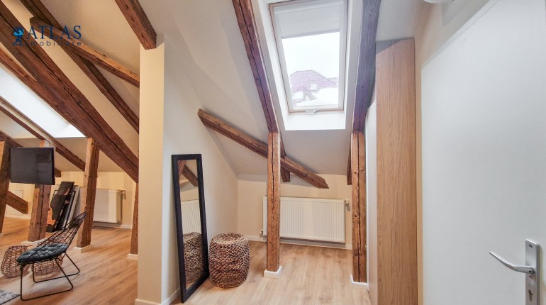 Accesul catre mansarda este individual, pe o scara de lemn, intrarea se face intr-o zona de vestibul care are amenajata si un mic birou;