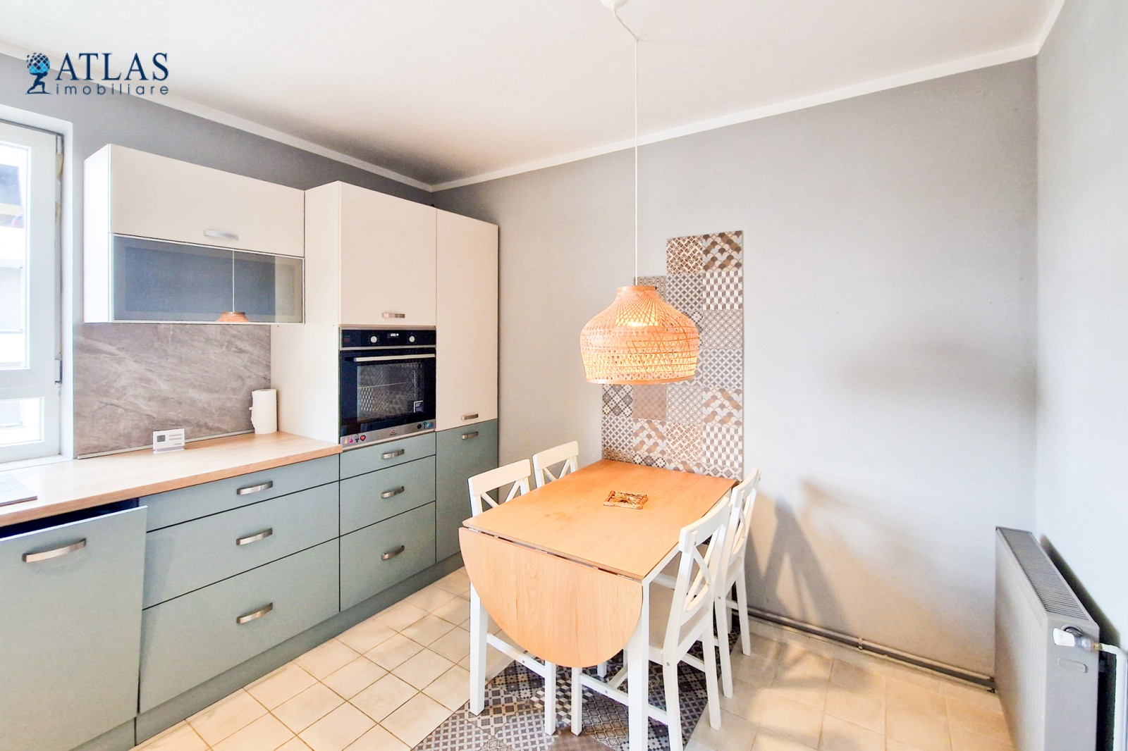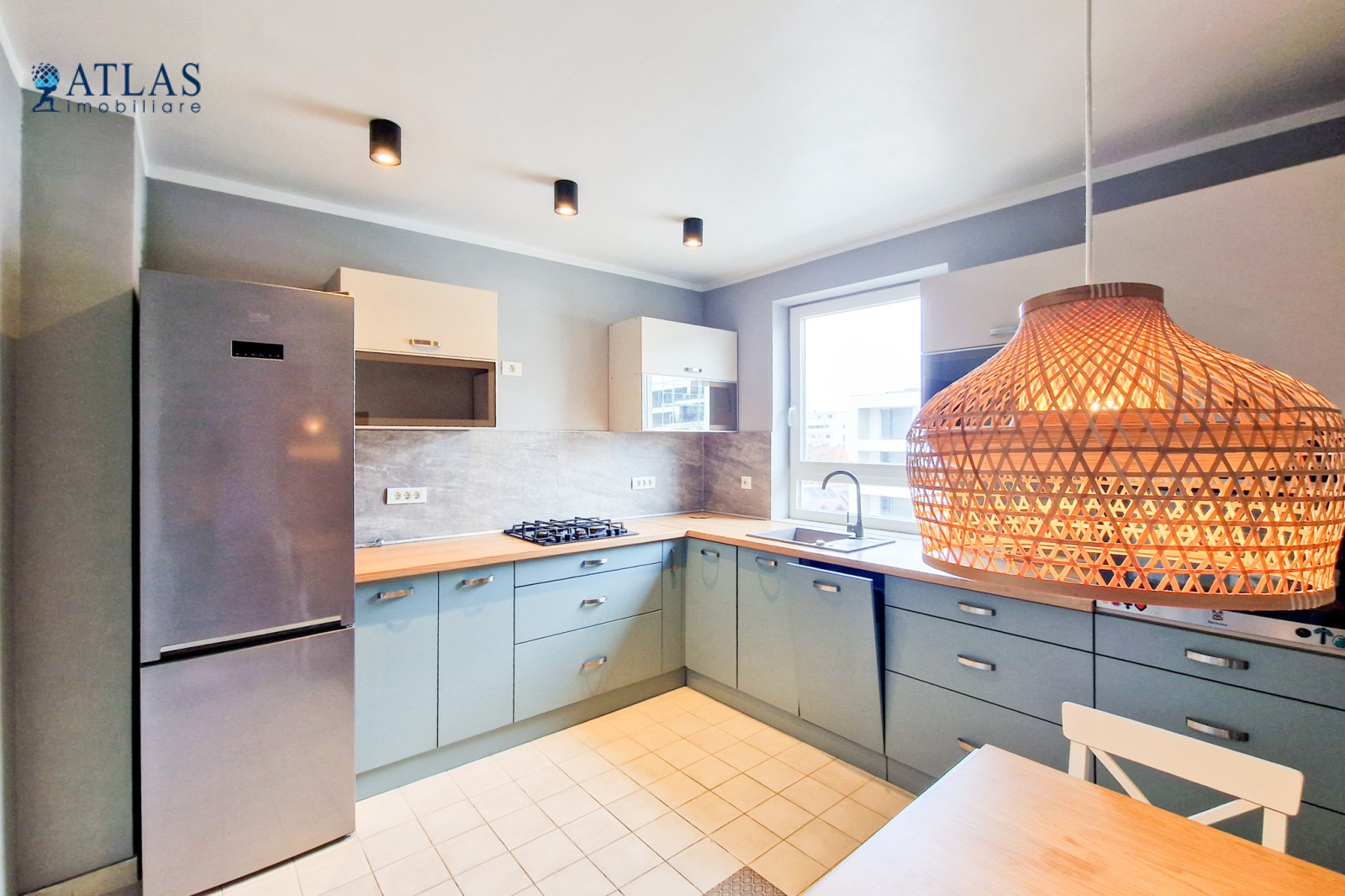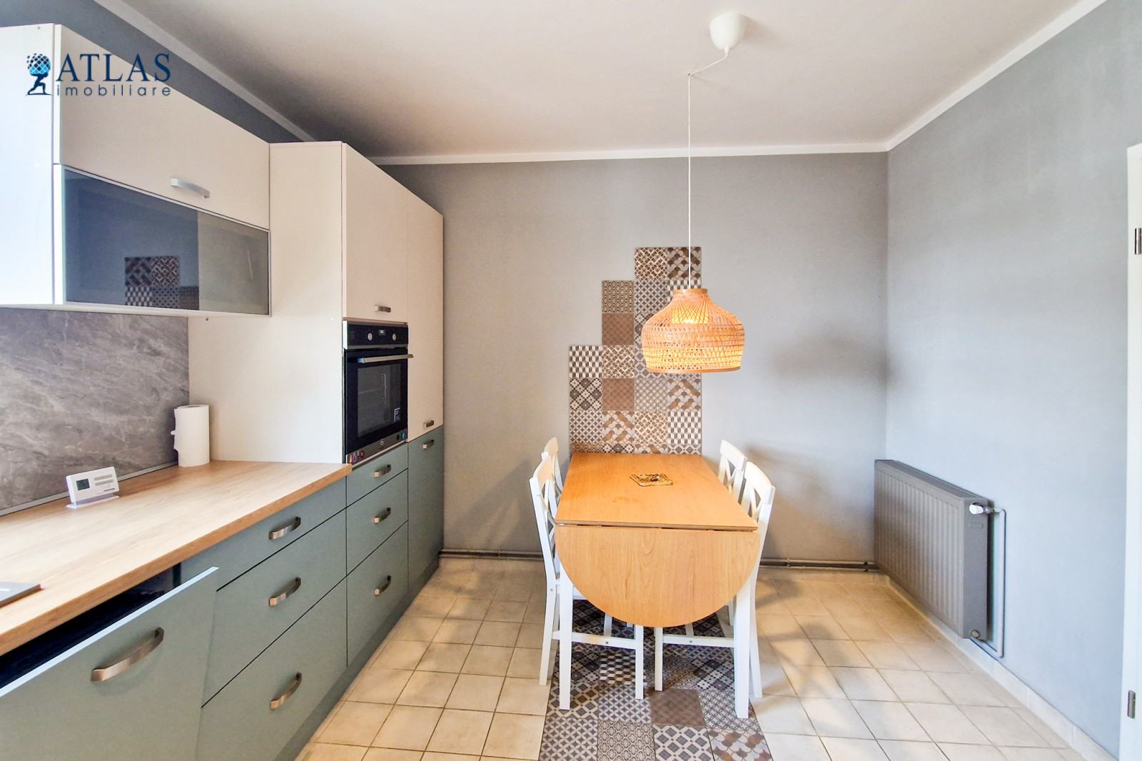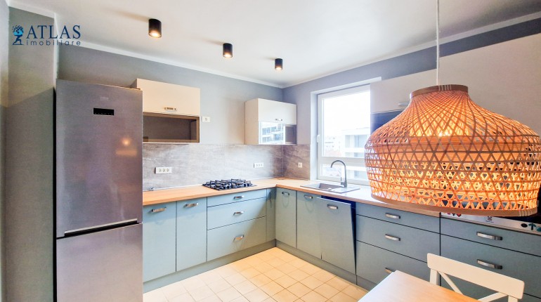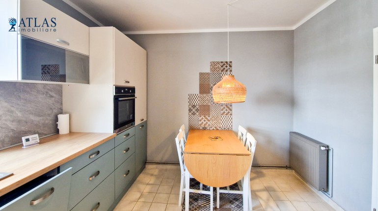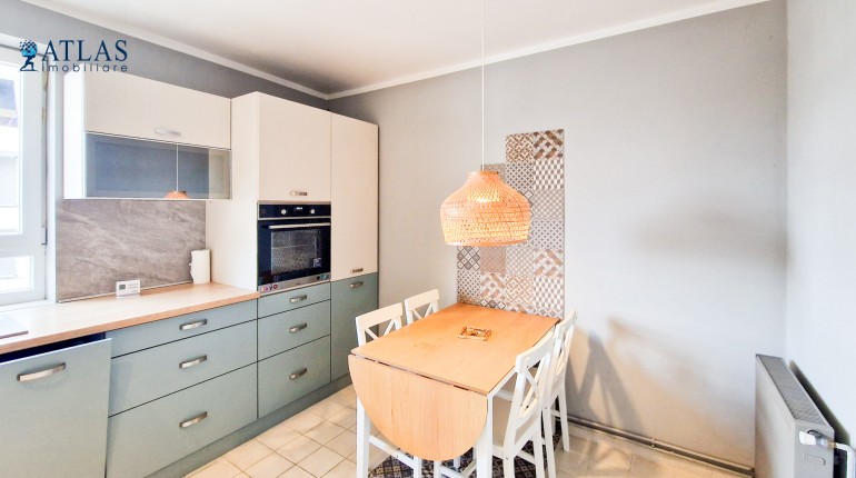 Bucataria este separata, ceea ce este un avantaj pentru pasionatii de gatit, bine dotata si amenajata cu mobilier modern. Dotari: frigider de dimensiuni mari, masina de spalat vase, masina de spalat haine, aragaz, cuptor electric, centrala termica noua marca Bosch. Spatiile de depozitare sunt generoase iar zona de luat masa poate acomoda 5 - 6 persoane.