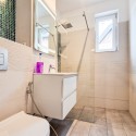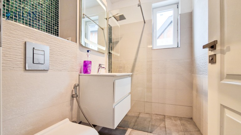 Baia este cu dus, tip walk-in, cu geam pentru o aerisire naturala rapida.